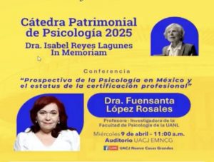 La Universidad Autónoma de Ciudad Juárez (UACJ), a través de la Extensión Multidisciplinaria Nuevo Casas Grandes (EMNCG) y el Departamento de Ciencias Sociales, inauguró la Cátedra Patrimonial de Psicología 2025 doctora Isabel Reyes Lagunes in Memoriam con la conferencia: «Prospectivas de la Psicología en México y el estatus de la certificación profesional» impartida por la doctora Fuensanta López Rosales.
